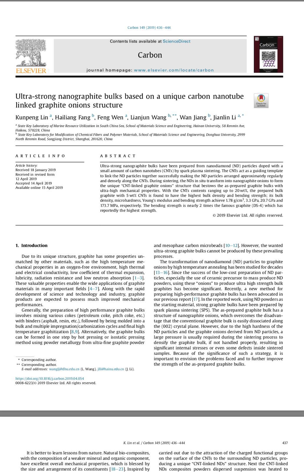 近日,SWAG直播 李建林教授、文峰教授科研团队在高性能石墨材料研究中取得重要进展。 这项工作的部分研究成果发表在碳结构材料的国际顶级期刊Carbon (Ultra-strong nanographite bulks based on a unique carbon nanotube linked graphite onions structure, 2019, 149, 436-444)。 在前期的研究工作基础上,研究人员通过仿生设计,在纳米金刚石粉体中引入少量碳纳米管,巧妙地解决了金刚石粉体转化制备石墨块体内部残余应力较大的难题。所制备的石墨块体为纯石墨相,其抗弯强度达到目前最强石墨材料的2倍,这一工作有望突破石墨材料的高精度加工的技术瓶颈。目前正在和有关单位合作,开发某些领域的专用石墨元器件。 SWAG直播 2016级硕士研究生林坤鹏为论文第一作者。这项工作是与东华大学的相关课题组合作共同完成。(文/图:李建林)