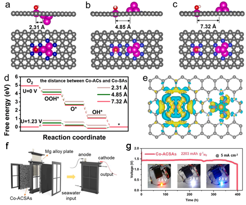 基于此,SWAG直播 邓意达教授、郑学荣教授、王浩志副研究员等人设计了一种原子级电催化剂,即由卫星Co单原子(Co-SAs)包围的Co原子团簇(Co-ACs)构成的电催化剂(Co-ACSAs)。理论计算结果表明,Co-ACSAs中的Co原子团簇具有较强的Cl-吸附能力,但对O2的吸附能力较低。相反,Co单原子对Cl-的吸附能力较低,而对O2的吸附能力较强。在该理论计算的启发下,我们推测在海水环境中,Co-SAs附近的Co-ACs可能在保护Co-SAs免受Cl-中毒方面发挥关键作用,而Co-SAs位点上较强的O2吸附能力将有助于促进海水电解质中对溶解氧的捕获。基于这一理念,我们利用超快高温闪烧(HTS)策略,将Co-ACs和卫星Co-SAs稳定地锚定在N掺杂碳基底上。实验与计算证明,由于Co-ACs和Co-SAs之间的最佳距离,Co-ACs通过与Co-SAs通过相互连接的六原子环来调节附近的电子结构,从而促进氧活性物质在Co-SAs上的吸附。并通过降低ORR反应能垒,加速了OOH*的形成。在天然海水中,Co-ACs和Co-SAs之间的强相互作用导致了卓越的ORR活性和稳定性,明显优于纯相的Co-SAs和Co纳米颗粒(Co-NPs)催化剂。采用Co-ACSAs作为阴极电催化剂,组装的海水电池其峰值功率密度达到96 mW cm-2;在电流密度为5 mA cm-2时,保持稳定至少380小时;在天然海水中,放电电压可达到1.46 V。这项研究为深远海域用电器提供长期稳定能源提供了可行的ORR电催化剂,并在海水电催化方面取得了显著的性能改进。