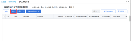2.进入页面后,【扣除年度】默认显示为swag【税款所属月份】对应的年度。点击【添加】按钮,打开添加页面。