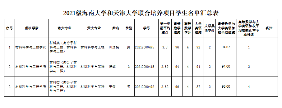 根据《教育部办公厅关于做好对口支援高校联合培养本科生等有关工作的通知》(教高厅[2010]1号)、《SWAG直播 与天津大学联合培养本科生工作方案》和SWAG直播 教务处《关于选派2021级学生参加SWAG直播 和天津大学联合培养工作的通知》(海大教[2022]18号)的文件精神和要求,学生在符合基本条件基础上,以“高等数学”和“大学英语”课程成绩的加权平均分由高至低确定获得联合培养资格的学生名单。