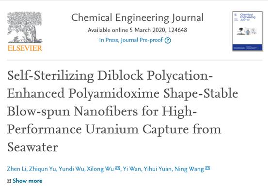 她不仅学习成绩优秀,也在科研创新方面,勤奋努力,坚持不懈,放弃寒暑假休息时间,积极参与科研项目。在南海海洋资源与利用国家重点实验室学习期间掌握了氨基酸类聚合物、MOF材料、制备纳米纤维材料的新方法--溶液喷射纺丝的合成技术,掌握材料常用FTIR、NMR、GPC、SEM、 EDS、XRD、XPS、BET、DLS、ICP-MS、酶标仪等表征方法,并可独立操作仪器,熟练使用Origin、Chembiodraw、MestReNova、ImageJ、XPSPEAK等软件,累计阅读英文文献百余篇,具备一定的科研能力,且以第一作者在Chemical Engineering Journal(Q1 IF8.36)上发表学术论文《Self-sterilizing diblock polycation-enhanced polyamidoxime shape-stable blow-spun nanofibers for high-performance uranium capture from seawater》一篇。此外,还与同学合作设计发明专利一项(一种处理海上石油污染物的新方法/公开号CN108640220A),实用新型专利两项(一种新型旋转电磁充电装置/专利号201920314390.8/一种新型的双动榨汁机专利号: 201920314761.2)。积极发展自己的兴趣爱好,参加课外实践课程,2018年7月参加由北京大学考古文博学院、北京大学陶瓷考古与艺术研究所主办的«历代青花画法研究»实验考古暑期课程,以第二作者在《人类文化遗产保护》上发表论文一篇。现已被推免到长春应化所攻读硕士研究生。
