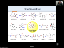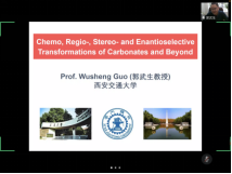 接下来郭武生教授进入学术主题:碳酸酯在合成化学中的应用。首先郭教授对碳酸脂在合成化学中的应用背景做了简单的介绍,继而展开报告。碳酸酯由于其独特结构而具有独特的活性,是精细化学合成领域的重要原料。通过合理的催化体系设计,可以控制碳酸酯参与反应的具体反应位点,从而实现立体选择性和手性选择性可控的化学反应,进而实现复杂药物分子中间体或合成高性能功能材料原料的高效合成。催化体系涉及氢键作用有机小分子催化和过渡金属催化过程。在本次报告会中,郭武生教授通过几个具体形象的例子,向大家介绍了控制碳酸脂参与反应的具体反应位点的方式方法以及可以解决的一系列问题,比如一些很复杂的开环反应可以通过这种方式不仅降低实验风险还可以大大提高反应物的产率。最后,郭武生教授向大家介绍了他的课题组,并且对他科研路上给予他指导与帮助的老师表示感谢。