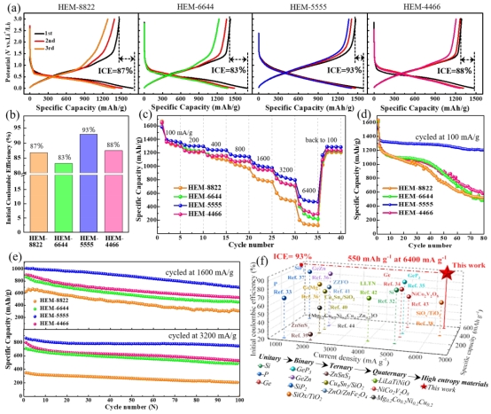 图4. 系列ZnxGeyCuzSiwP2高熵固溶体的充放电曲线(a),首次库伦效率(b),倍率性能测试(c),循环性能测试(d-e)及文献报道性能比较(f)。