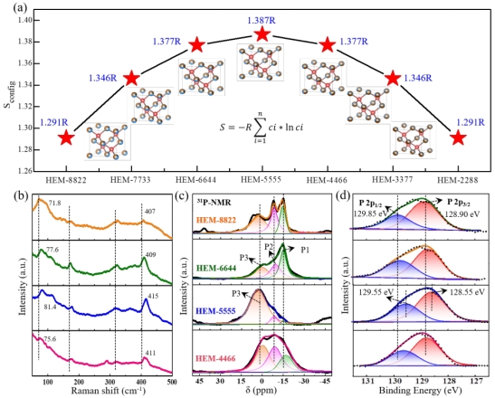 对上述合成的系列ZnxGeyCuzSiwP2构型熵进行计算,发现等比例固溶的Zn0.5Ge0.5Cu0.5Si0.5P2因其阳离子无序程度最大具有最高的构型熵,其构型熵的差异也在Raman表征(峰位红移)、31P-NMR固体核磁共振测试(P3占主导)和XPS图谱(P 2p峰位低结合能位移)中得到进一步探究和验证。