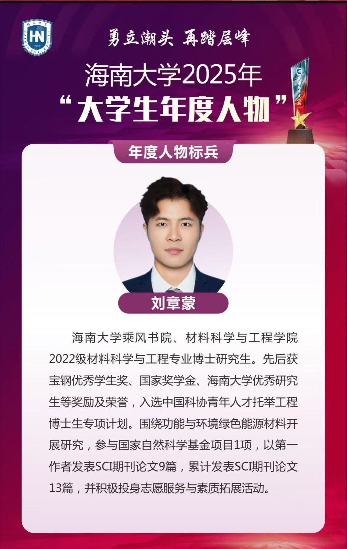 刘章蒙,SWAG直播 2025年大学生年度人物标兵,SWAG直播 2022级材料科学与工程专业博士研究生,2025年入职海南医科大学。他曾获宝钢优秀学生奖、国家奖学金、SWAG直播 优秀研究生等重量级荣誉;作为“中国科协青年人才托举工程博士生专项计划”首批入选者,获中国青年科技工作者协会托举支持;更包揽“校研究生优秀毕业生”“校研究生年度人物标兵”等称号,用一项项殊荣铺就能力进阶的坚实阶梯。